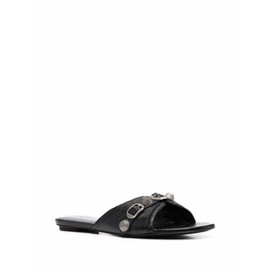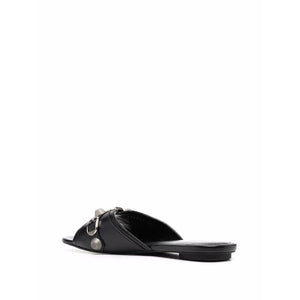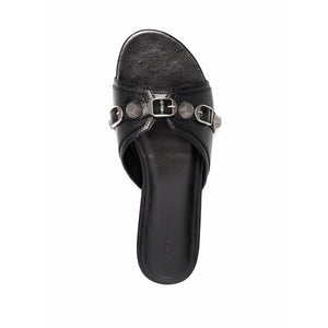 Black leather Cagole leather sandals from BALENCIAGA featuring leather lining, decorative buckle detail, open toe, slip-on style, branded insole and low heel. Le Cagole leather flat sandals Size and Fit - Heel 0,6 in / 1,5 cm