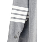 Thom Browne’s oversized Cardigan features an elegant V-neck and front button closure. The garment is embellished with a striped grosgrain detail under the placket and raglan shoulders, enhancing its contemporary design. The distinctive white 4-Bar detail on the left sleeve and striped grosgrain tab behind the collar add a distinctive touch. With two patch pockets on the front and ribbed trim, this cardigan combines style and comfort in a refined way.