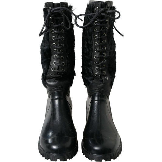 Dolce & Gabbana Black Rubber Lace Up Shearling Rain Boots Shoes