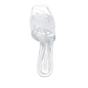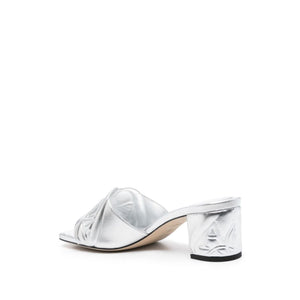 silver-tone calf leather metallic finish Seal-logo embossed effect square open toe branded footbed low block heel leather outsole slip-on style Metallic leather heel sandals Size and Fit - Heel 2 in / 5 cm
