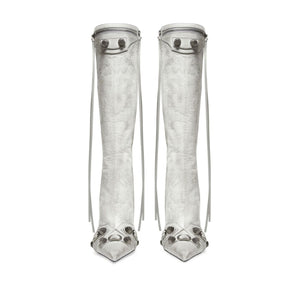 Cagole point-toe boots from BALENCIAGA featuring optical white, lambskin, pointed toe, stud embellishment, zip details, silver-tone hardware and stiletto heel. Le Cagole leather boots Size and Fit - Heel 9 cm