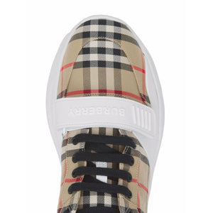 Archive beige/black/white organic cotton Vintage Check-pattern touch-strap sneakers from BURBERRY featuring leather trim, Vintage Check pattern, front touch-strap fastening, round toe, panelled design, front lace-up fastening, branded insole, padded ankle and rubber outsole. New Regis sneakers Size and Fit - Heel 1,4 in / 3,5 cm; Platform 1,2 in / 3 cm