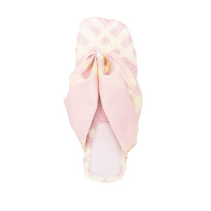 light pink/yellow square open toe satin strap check print branded insole terry-cloth effect lining signature Equestrian Knight motif at the sole flat leather sole Check thong sandals Size and Fit - Heel 0,8 in / 2 cm