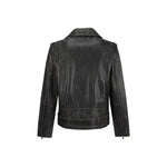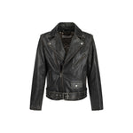 Leather Golden Biker Jacket by Golden Goose, worn vintage effect design, double-breasted front zipper closure, large classic lapels, two vertical welt pockets with zipper for closure, leather waistband adjustable by metal buckle, welt pocket on front, front flap pocket closable by magnetic button, sleeves adjustable by zipper, regular fit.