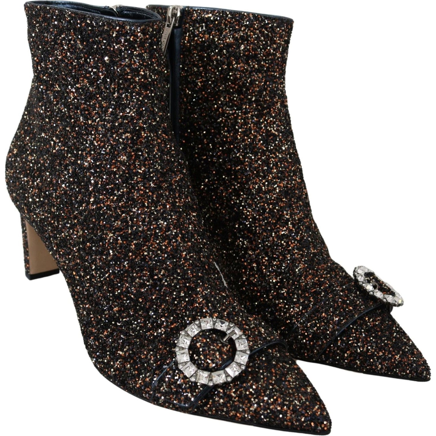 Step into luxury with these exquisite Jimmy Choo ‘Hanover 65’ heeled boots. Perfect for elevating any ensemble, they come brand new with tags, a protective dust bag, and the original shoe box. These boots are crafted with a blend of fabric and glitter leather, featuring a sharp pointed toe and secure zipper closure for a sleek and stylish silhouette. The amethyst mix color adds a touch of unique glamour to your stride, with a comfortable 6.5 cm heel to carry you with grace.
