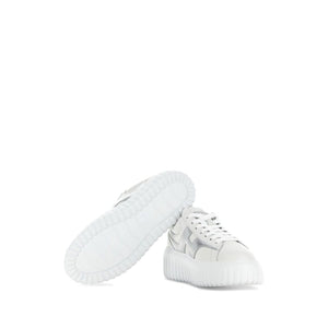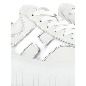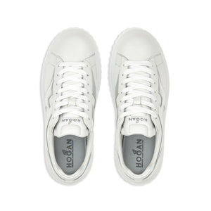 white leather metallic finish front lace-up fastening logo-print tongue branded insole round toe flatform sole H-Stripes leather sneakers Size and Fit - Heel 2,2 in / 5,5 cm, Platform 1,6 in / 4 cm
