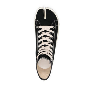 Tabi split-toe high-top sneakers from Maison Margiela featuring black, cotton, branded leather insole, split toe, front lace-up fastening, ankle-length and flat rubber sole. Tabi canvas sneakers Size and Fit - Heel 1,2 in / 3 cm; Platform 1,2 in / 3 cm