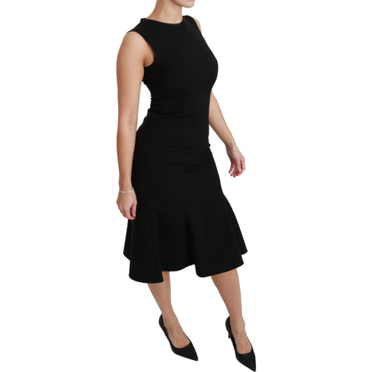 优雅黑色剪裁喇叭羊毛混纺连衣裙
