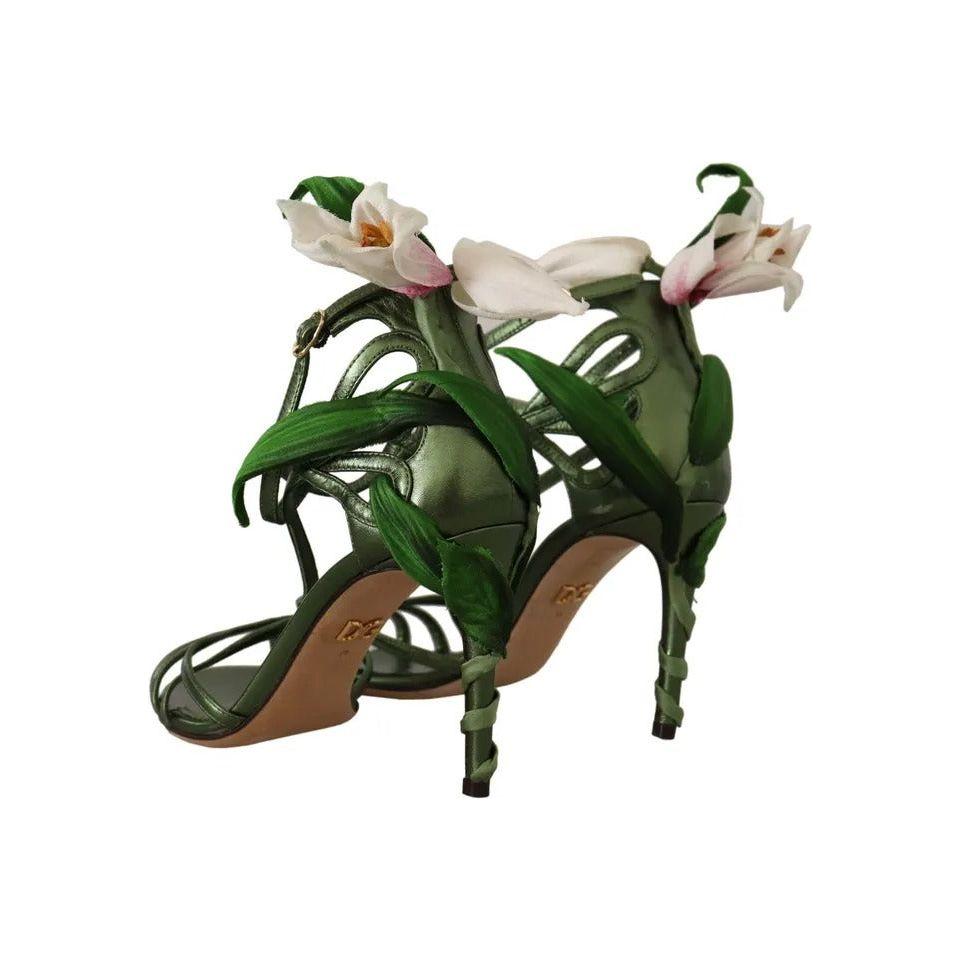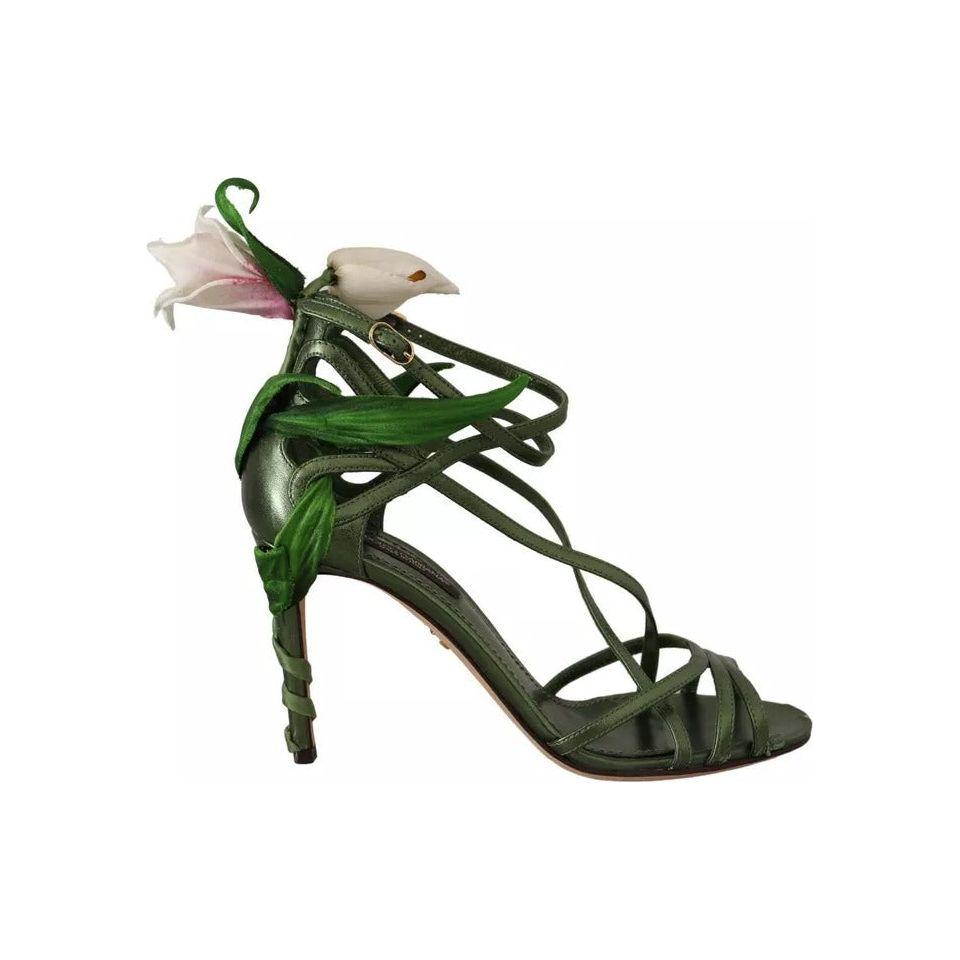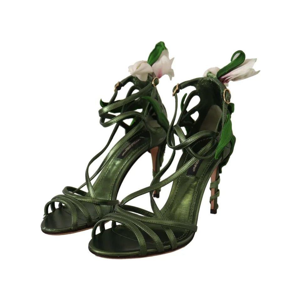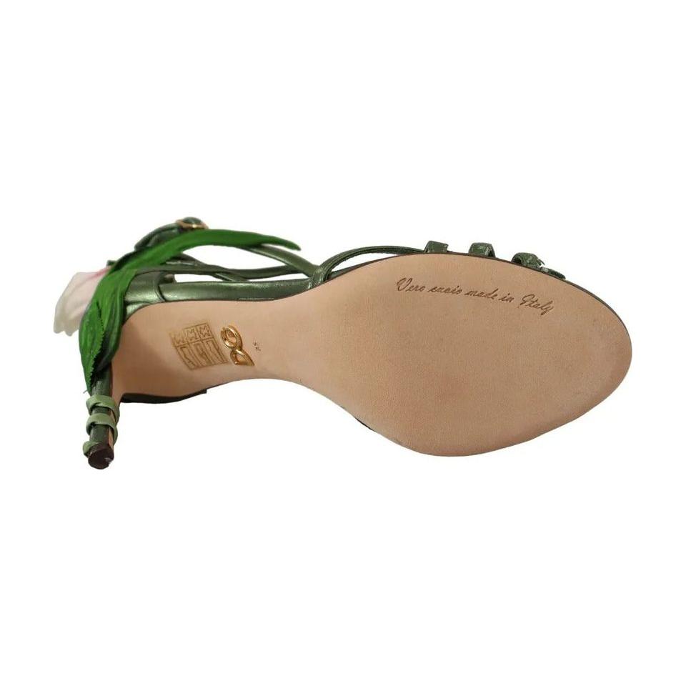 Dolce & Gabbana Acid Green Leather Strappy Flower Heels Sandals Shoes