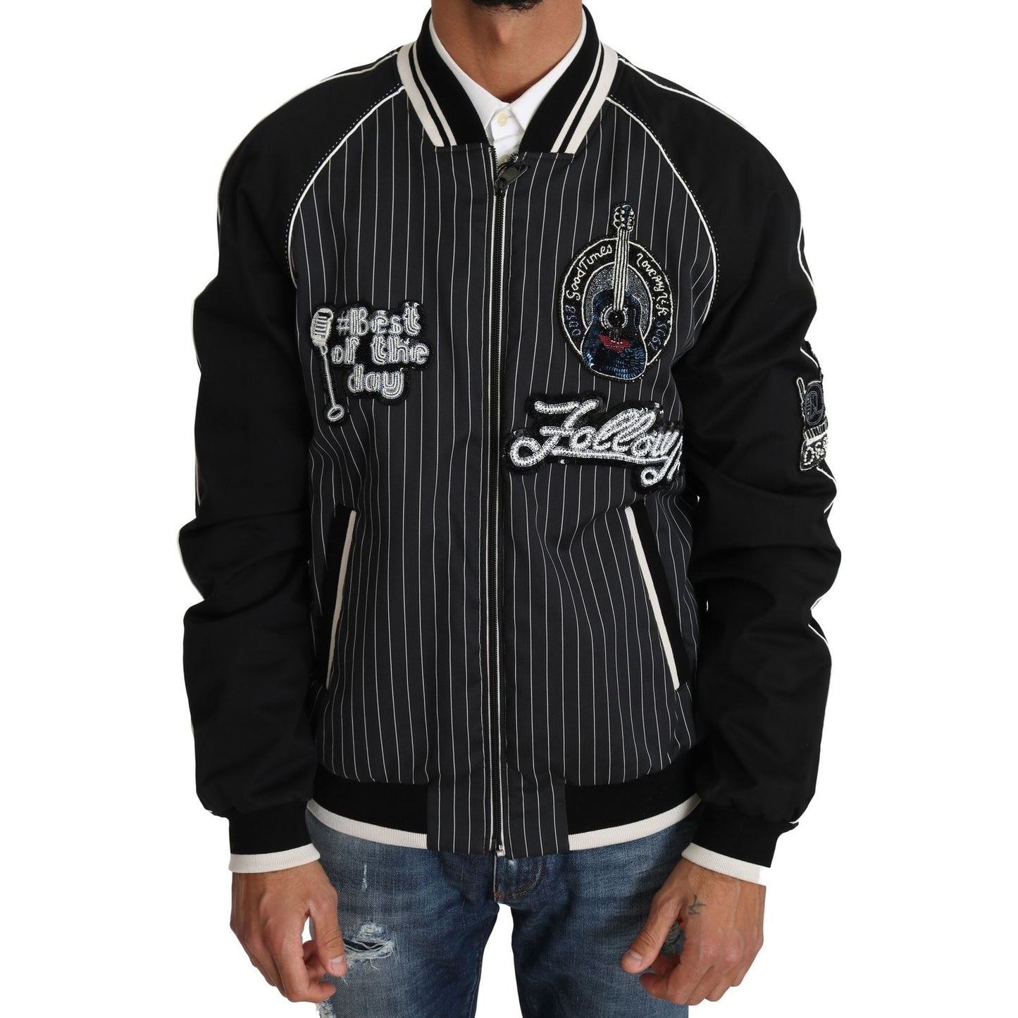 这款令人惊艳的 Dolce & Gabbana 飞行员夹克完美融合了奢华与前卫设计,让您尽显精致风格。这款夹克饰有亮片和串珠贴花,以条纹图案的别致黑色背景为背景,闪闪发光。全拉链开合、两个前袋和两个内袋兼具实用性和时尚感。无可挑剔的徽标细节为品牌增添了独特的标志性风格,而优质材料成分确保了卓越的贴合度和舒适度。这款意大利制造的单品一定会让您成为众人瞩目的焦点,让您的衣橱更上一层楼。