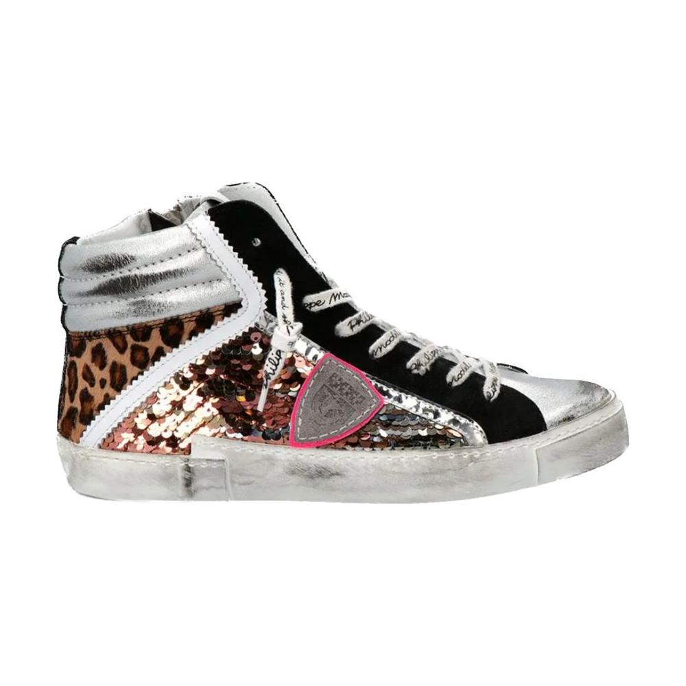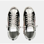这款时尚的灰色皮革运动鞋饰有别致的银色皮革嵌件和闪亮的亮片细节,让您步入优雅的殿堂。独特的品牌标志优雅地点缀在鞋舌和鞋后跟上,彰显其设计师品质。这款运动鞋采用意大利精湛工艺制作而成,是舒适和奢华的典范。