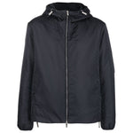 navy blue monogram jacquard logo-engraved silver-tone hardware drawstring hood front two-way zip fastening long sleeves elasticated cuffs straight hem Nylon blouson jacket