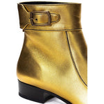 Made of gold-colored leather, square toe, visible stitching, strap with buckle above the ankle, rear zipper, black leather outsole. Heel height: 3 cm. Composition: 100% Leather.